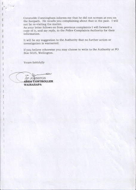 The letter above waffles on making excuses for Constable Cunningham's harassment of me regarding the "Billsticking" charge. The Police charged me with putting up notices to advertise a public meeting to discuss the illegal takeover mismanagement and closure of the Carterton Community Centre. These notices said "You are invited to a public meeting to discuss the mismanagement and illegal takeover of the Carterton Community Centre" and the date and time of the meeting. Hardly a criminal act warranting the intervention of the police - not for billsticking that's for sure - investigation of the fraud and mismanagement by all means. The allegation that these notices might in any way constitute "harassment" is ridiculous - and corrupt!