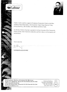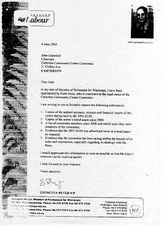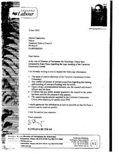 On 6th June 2003 I met with Georgina Beyer MP to discuss the allegations of fraud and serious mismanagement involving several people associated with the Carterton District Council who were involved with the running of the Carterton Community Centre. I provided Beyer with a considerable amount of information, including the financial reports and letters from several lawyers, confirming that the committee was acting with no lawful authority and making large, unauthorised payments to individuals in direct contradiction to legal advice, signing government contracts without lawful authority, etc.Beyer wrote to the group claiming to represent the Community Centre, and to the Mayor of Carterton, on 6th June 2003, regarding the allegations, and requested "copies of the audited accounts" for the 2000/2001 year among other things.