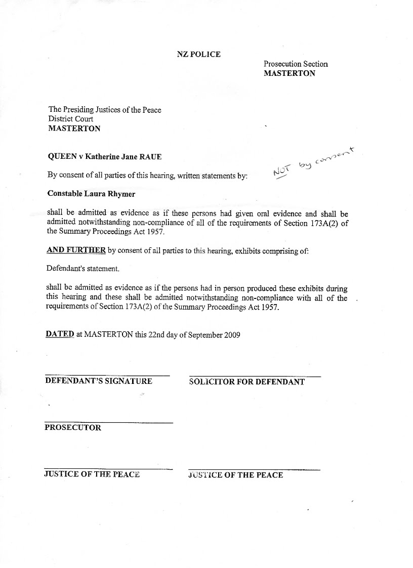 5. I have acted for Mrs Raue since being telephoned by her urgently on the evening of Wednesday 14 June 2006. She asked me to act for her, as she was defending five charges on the following Tuesday 20 June 2006. Two days had been set aside for the hearing, although Mrs Raue’s previous Counsel, Ken Daniels, had apparently originally asked for three days. A copy of his letter dated 1 6 February 2006 in which he expresses concern that the Masterton Police were proceeding with the charges is attached, marked “A”. FIRST BREACH