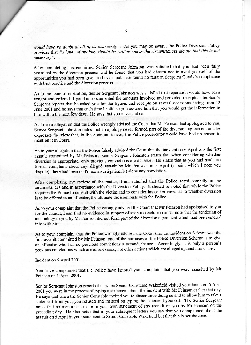 The letter above is once again a predictable litany of excuses, more information will be put up here in the following weeks, so keep an eye on this post which will be regularly updated with more copies of this correspondence. The third page of this letter is particularly damning, it actually admits that Senior Constable Jackson refused to look for the medical reports I had provided immediately to the police after the assault on me, because he "couldn't be bothered getting off his backside"!!!!! But the PCA thought this was alright!