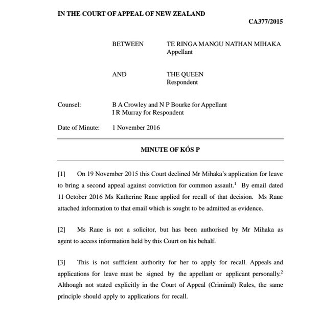 "We wish to urgently apply for recall of the decision of the Court of Appeal on the grounds that fresh evidence has recently been obtained which is evidence that a substantial miscarriage of justice has occurred, and it has been confirmed that Mr Mihaka never received any Disclosure according to the Criminal Disclosure Act.Judge Hastings recommended an amicus be appointed but the trial Judge (Kelly) decided not to do so - Mr Mihaka was a self represented litigant forced to represent himself because he couldn't afford to pay back a legal aid loan for something he was innocent of, he conducted his hearing in Te Reo, he was NOT properly warned of the consequences of giving evidence himself, or the fact that he didn't need to and at the end of the case for the prosecution the Judge should have realised that the evidence given on oath did not stack up against the Summary of Facts or the complainant's statement to Police, which are both attached. The only agreed fact is that the complainant inappropriately touched Mr Mihaka while Mr Mihaka was asleep - twice according to the information provided by Police recently.Judge Kelly shut Mr Mihaka down repeatedly as he tried to cross examine the prosecution witnesses and this was recognised by France J in his decision - if he had been allowed to cross examine adequately and provided with Disclosure these discrepancies might have been addressed!I refer to paragraph 5 of this decision which states that the alleged incident occurred in the morning just after the complainant woke up and made coffee as described in the first four lines of para 5. Attached is the statement of the complainant to Police and the Police Summary of Facts, both of which directly contradict the assertion in para 5 of the decision. Both these documents state that the alleged incident occured at night as the complainant was going to bed - not in the morning when he got up - and on two different dates - as well as the date in the Police officer's notebook which is different again!There is strong evidence of collusion between Housing New Zealand Corporation and Police regarding this matter, which is also currently before the Human Rights Review Tribunal, who have recently suggested sending it back to the District Court, and Mr Mihaka's lawyer has written to Police regarding defamation and slander after Housing New Zealand Corporation claims that they received information from Police regarding this matter which led them to evict Mr Mihaka - it is clear that the source of information was the complainant, not Police, and Police now DENY HNZC's claims - it is indisputable from an examination of the attached documents that this conviction is unsound, and that if Mr Mihaka had been provided with Disclosure as he was entitled, and properly warned about the consequences of giving evidence himself, he would have been in a position to cross examine the complainant effectively during the case for the prosecution, and ask for the charge to be dismissed prior to presenting ANY defence!Finally, Maori have a tradition of oral information, not written, and we request the opportunity to present our case in person, orally, to the Court. Mr Mihaka is seventy five years old and not able to write his entire claim down and we should not have to - both appeal lawyers should have realised that he had never received the Disclosure, and the discrepancies therein should have been addressed at the earlier appeals! Both Mr Mihaka and I have very limited resources available to us, adding further difficulties to the requirement that we put our entire case in writing - this matter is currently before the HRRT and is URGENT. We respectfully request a hearing, and a recall of this decision - France J was unaware of these documents and so was Mr Mihaka.Maori Agent for Te Ringa Mangu Mihaka."Katherine Raue